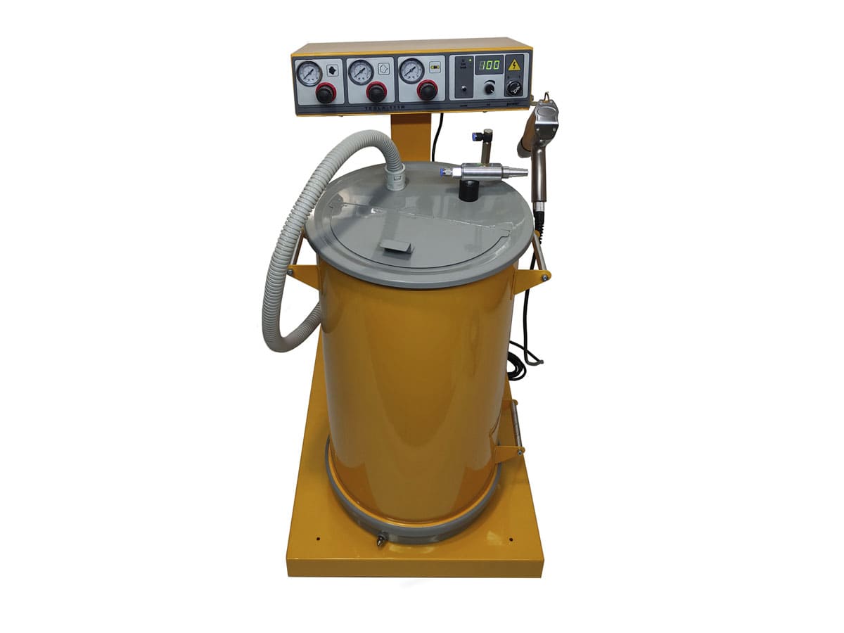 Недорогая, высокопроизводительная, надежная и простая в эксплуатации ручная установка напыления порошковых красок в электростатическом поле с баком 50л. Может комплектоваться различными типами баков по усмотрению заказчика. Имеет на входе регулятор давления и фильтр масло-влаго отделитель. Цифровой дисплей. Защита от высокого давления воздуха на входе для предотвращения разрушающего воздействия на пневмокомпоненты.
