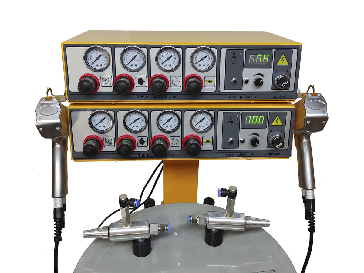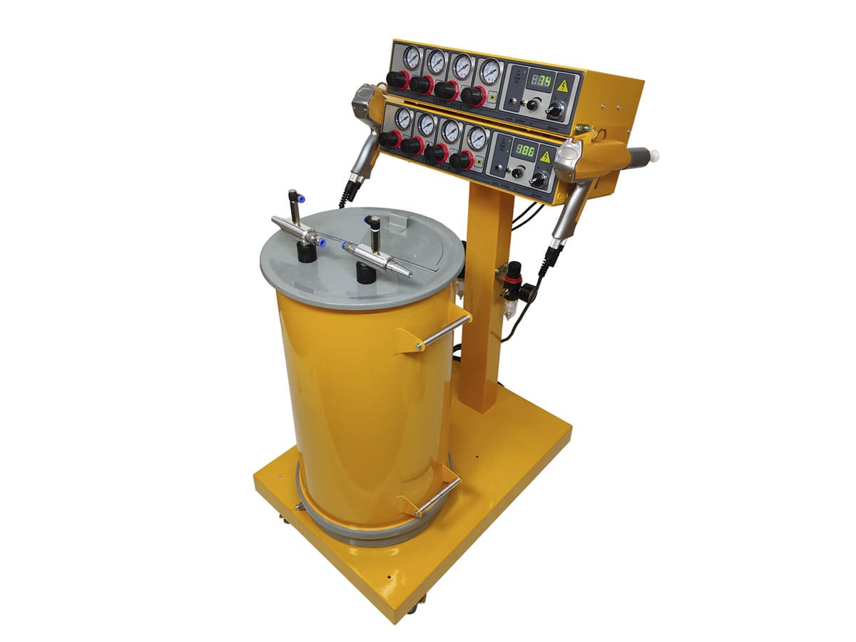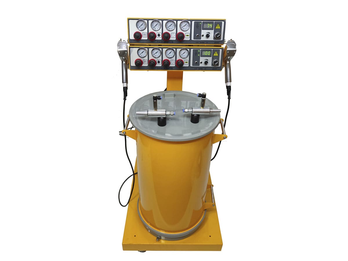 Позволяет работать сразу двум операторам с забором краски из одного бака. Все регулировки на лицевой панели: подача порошка, транспортного воздуха, обдув коронирующего электрода, ожижение порошка в баке.