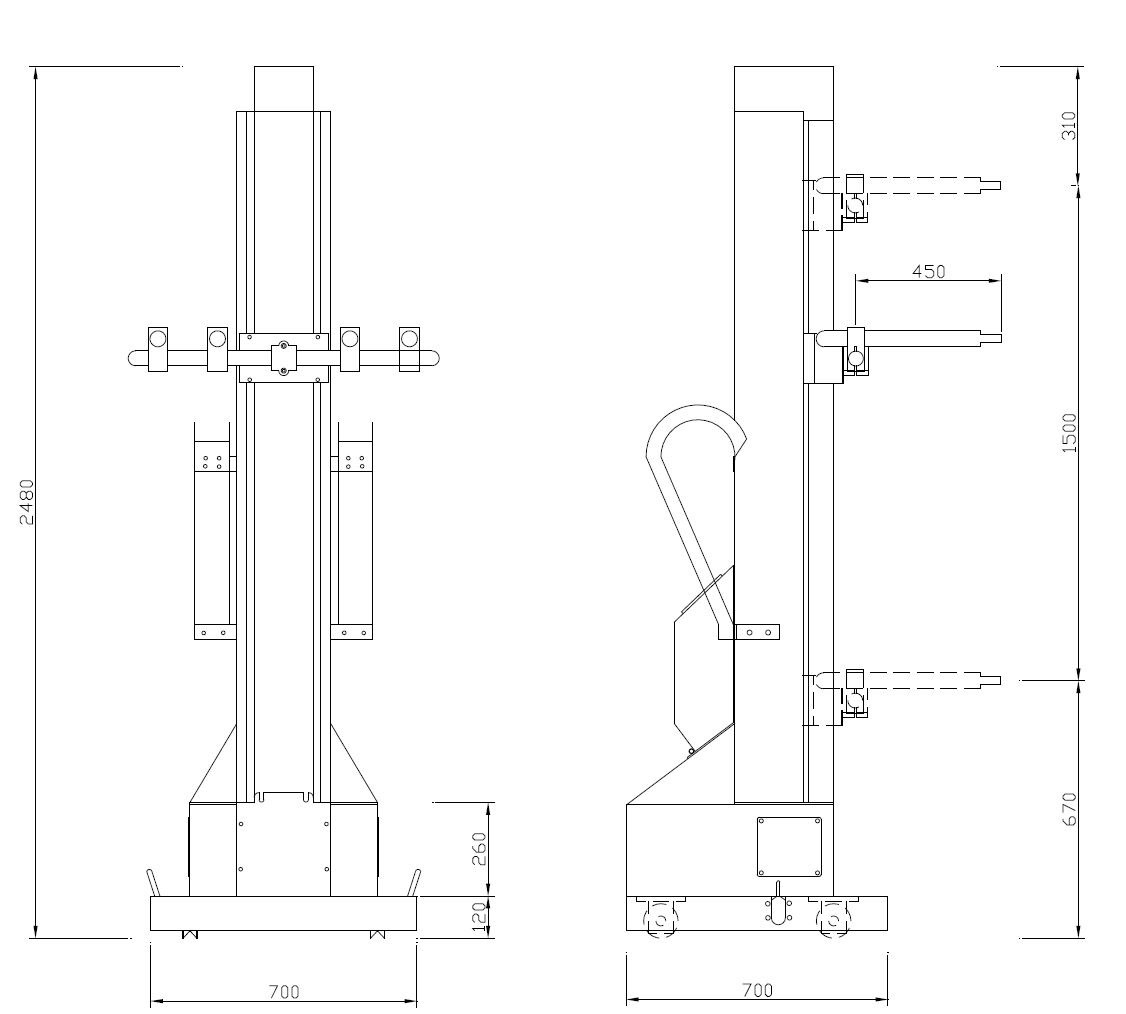 Стандартные варианты исполнения хода манипулятора 1.5м, 1.8м, 2м, 2.5м высота от основания до нижней точки опускания штанги 670мм от верхнего габаритного размера до высшей точки подьема штанги 310мм.